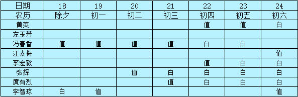 春节期间门诊医生值班表:大年三十(2月18日)----初六(2月26日)